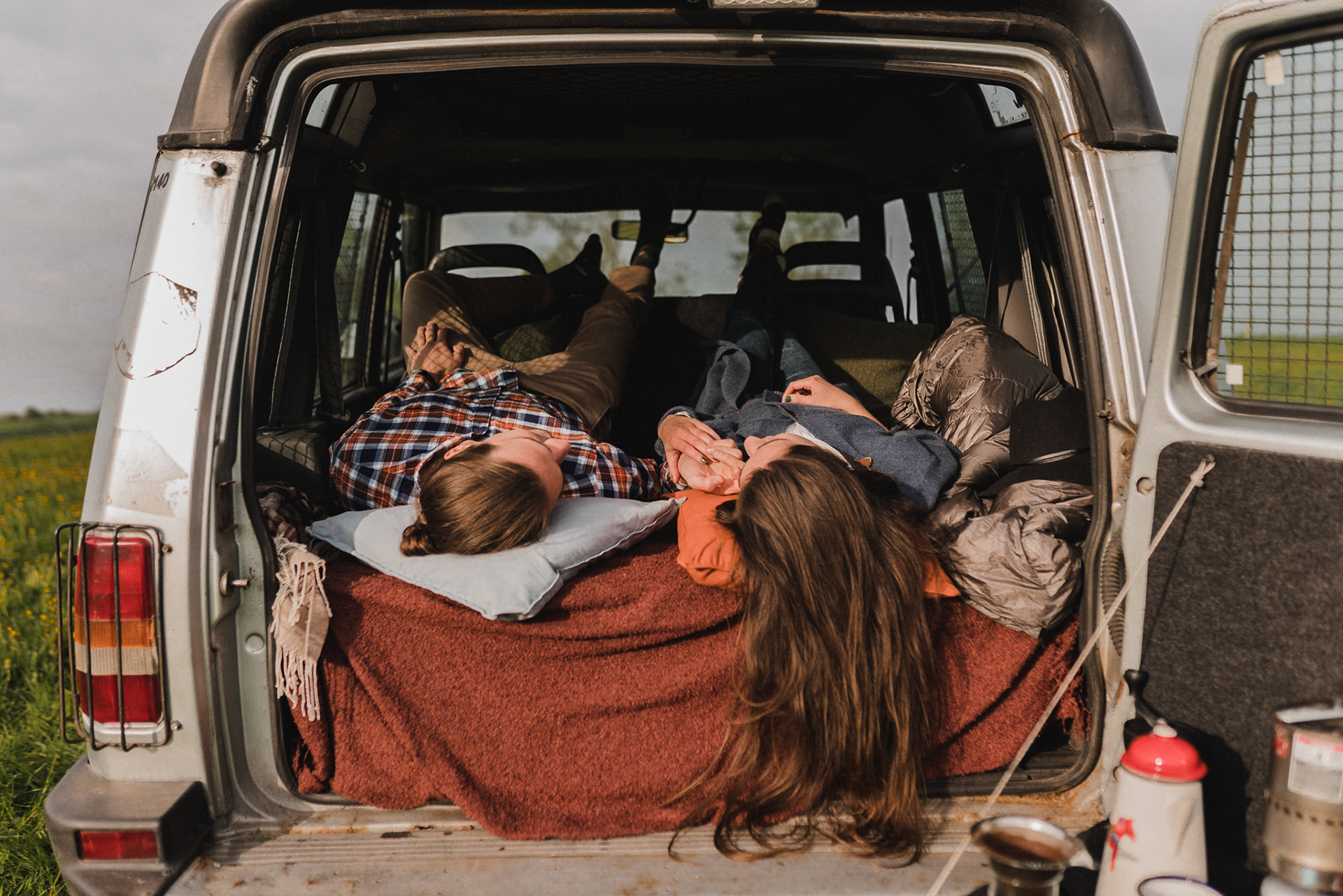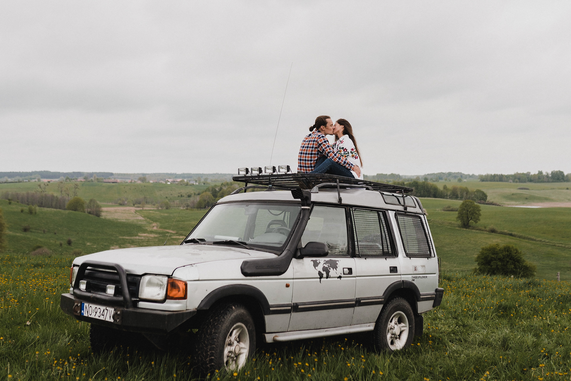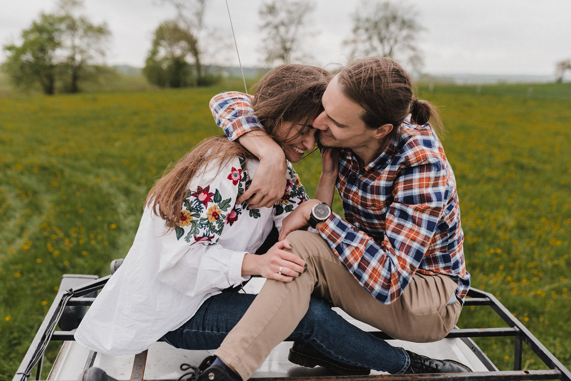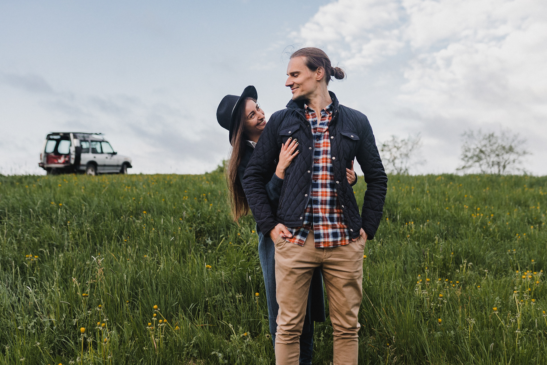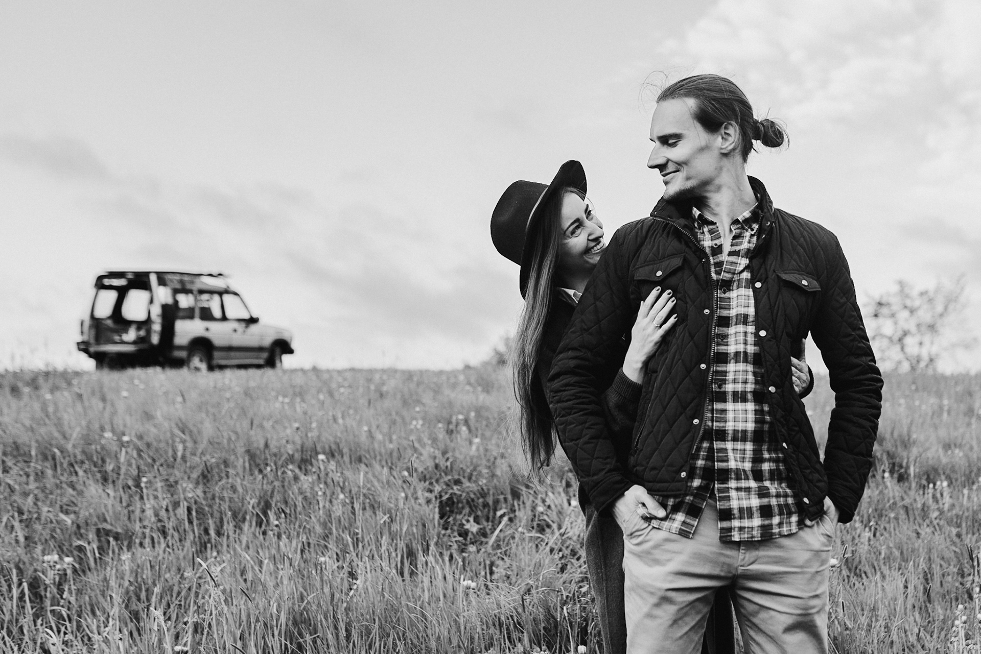 Sesję zaplanowaliśmy na sobotę, 14 maja. Zapowiadał się ładny wschód słońca, więc umówiliśmy się o 4.30 na miejscu zdjęć. Sprawdzając dzień wcześniej pogodę, nie zapowiadało się... tak spore zachmurzenie :D Słońce zawitało raptem na 15 minut - ale jakie to było 15 minut! Ciepłe, dobre. Z resztą cała sesja taka była - pełna ciepła, dobra, uśmiechów, przytulania, pocałunków w czoło i czułych spojrzeń. No i oczywiście był rytuał parzenia kawy, camperowy Landrover i piękne widoki.