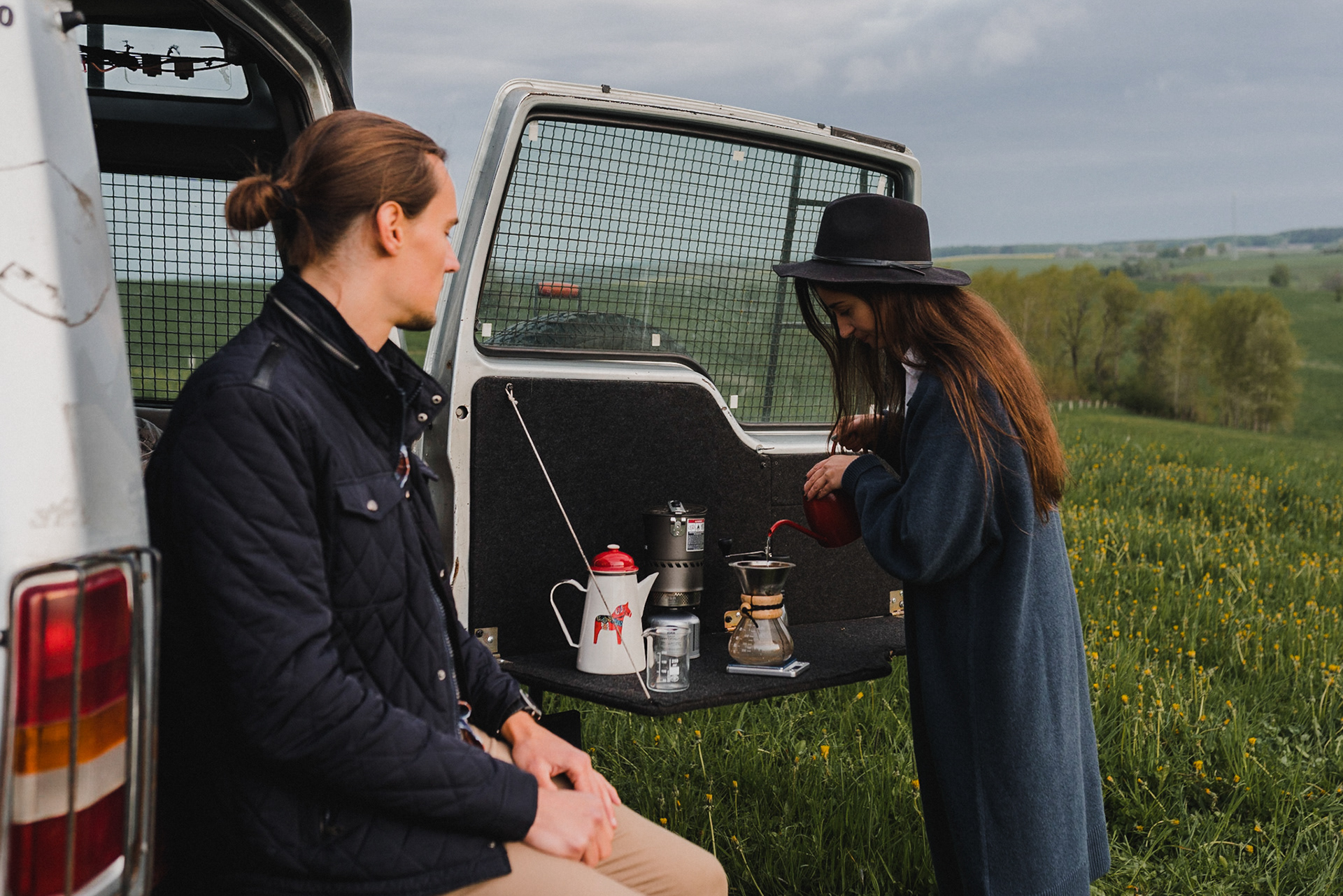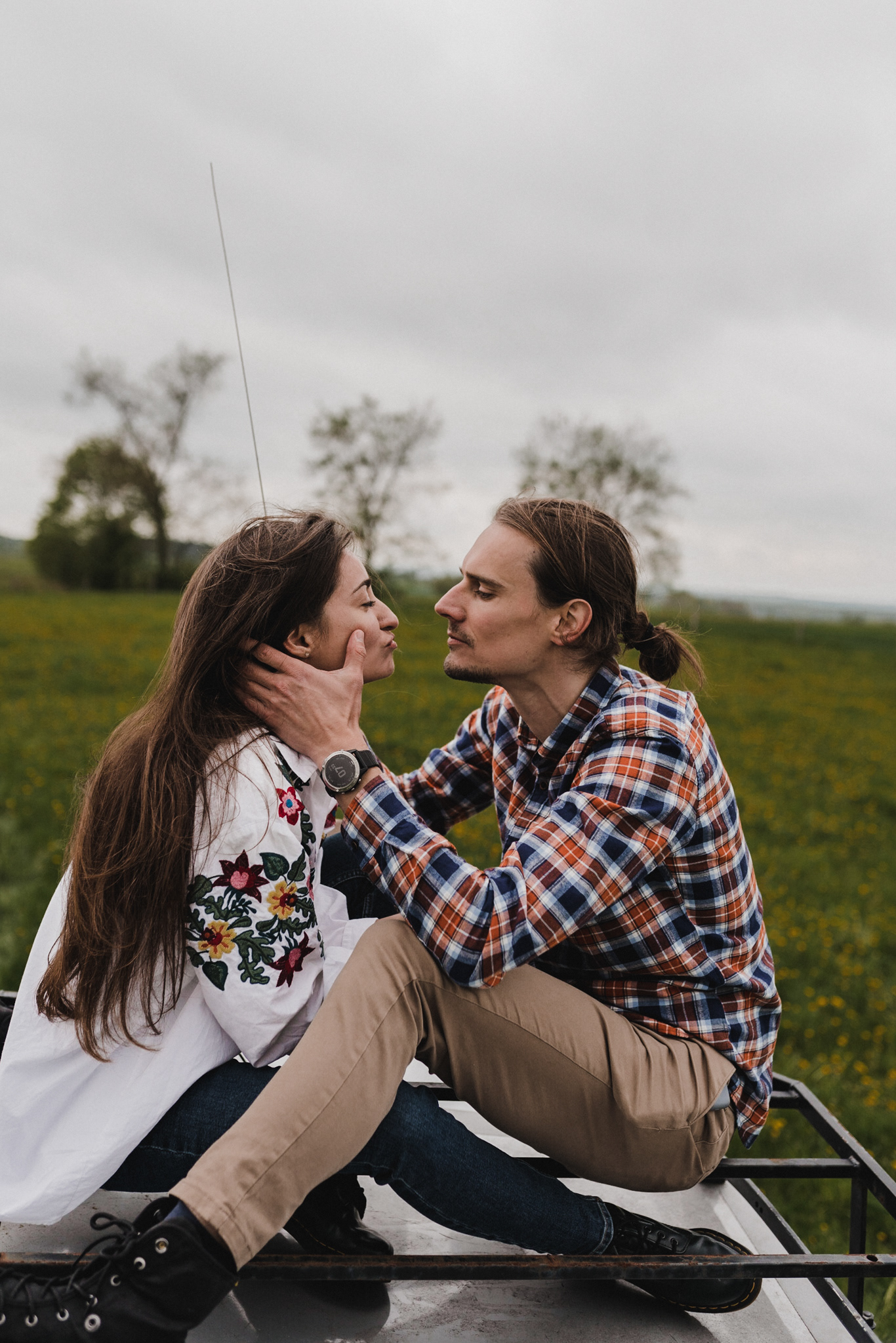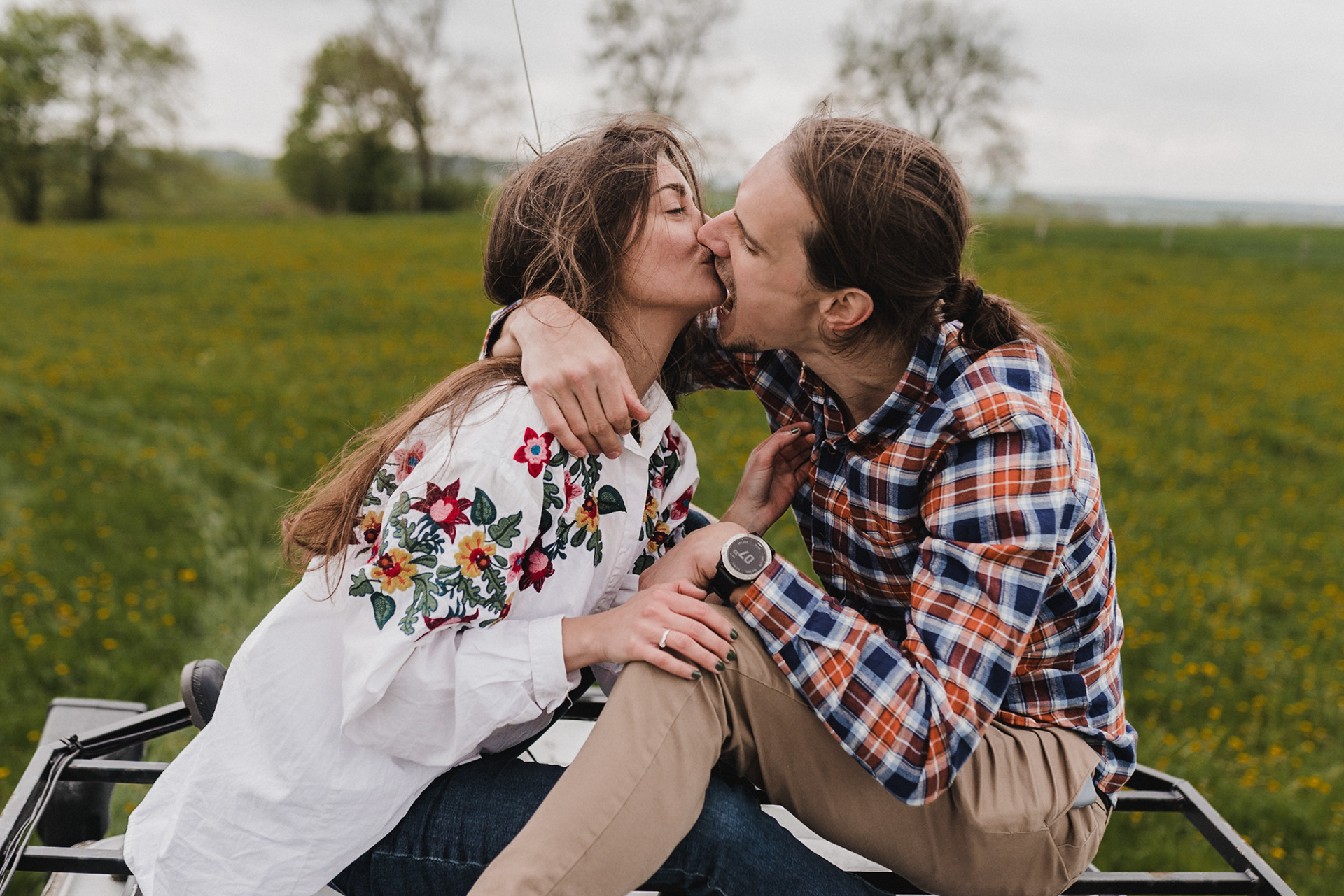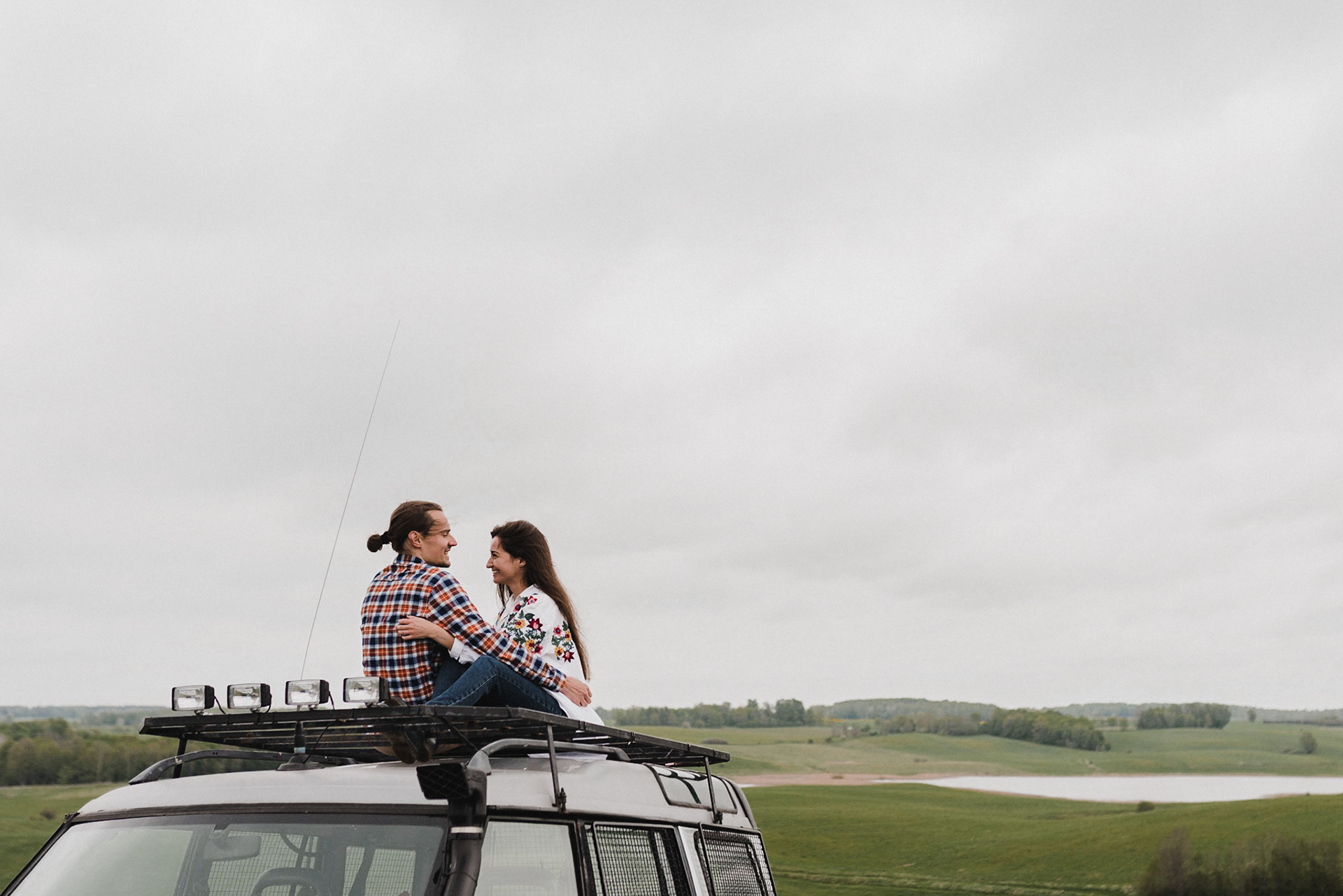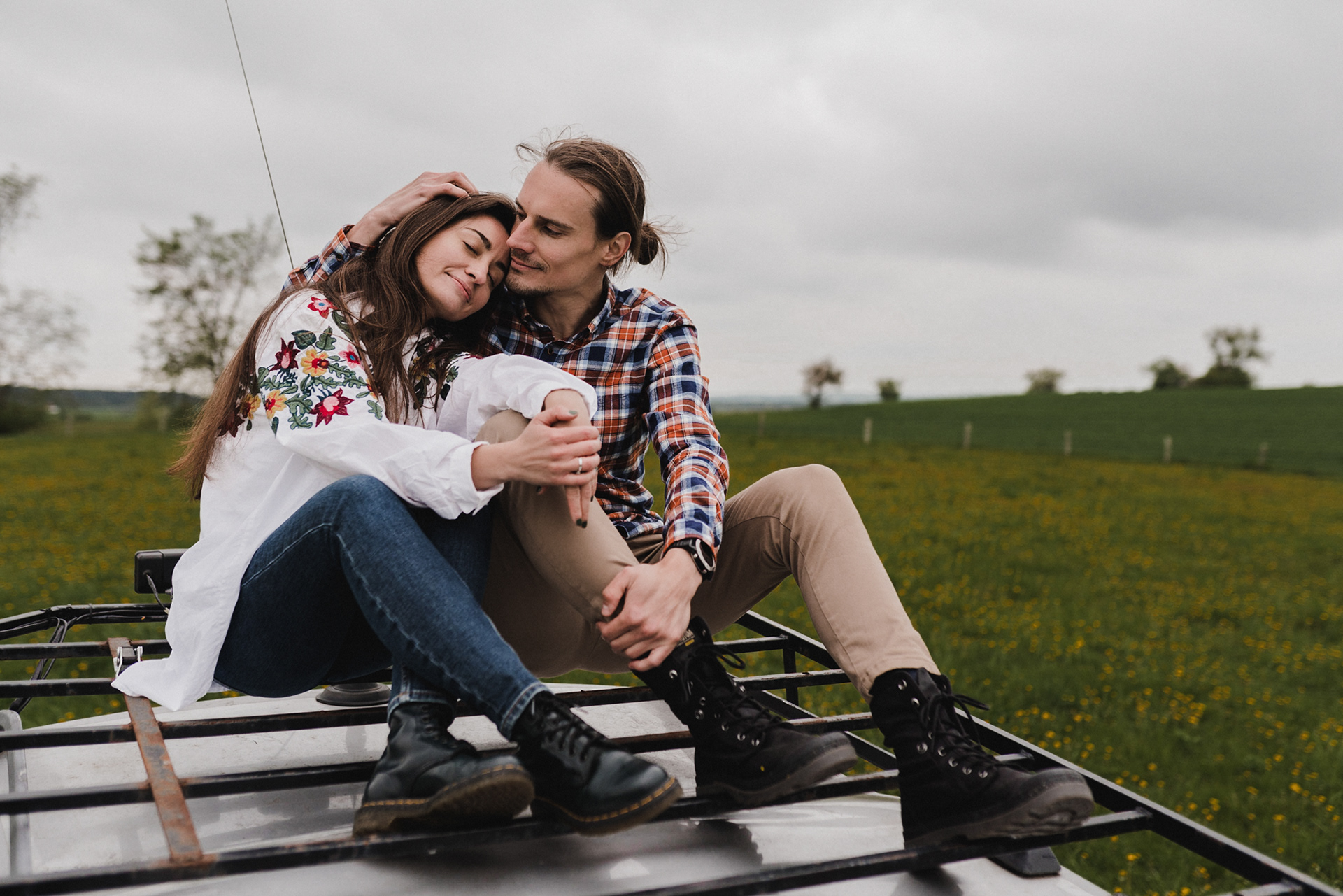 Sesję zaplanowaliśmy na sobotę, 14 maja. Zapowiadał się ładny wschód słońca, więc umówiliśmy się o 4.30 na miejscu zdjęć. Sprawdzając dzień wcześniej pogodę, nie zapowiadało się... tak spore zachmurzenie :D Słońce zawitało raptem na 15 minut - ale jakie to było 15 minut! Ciepłe, dobre. Z resztą cała sesja taka była - pełna ciepła, dobra, uśmiechów, przytulania, pocałunków w czoło i czułych spojrzeń. No i oczywiście był rytuał parzenia kawy, camperowy Landrover i piękne widoki.